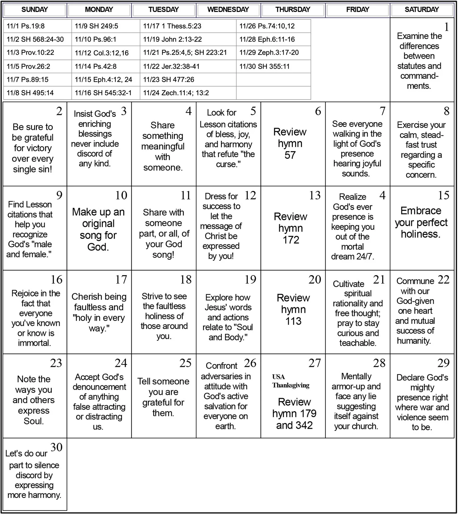 We are approaching a busier time of year, and I want to remind everyone of the fluid, timeless quality the calendar of spiritual activities represents. In fact, you may enjoy thinking about an activity before it’s associated date. For example, on October 9, I received a text of gratitude from a friend for the October 27th activity – the one about letting every kind of cleaning we do symbolize our eternal innocence. We found it wonderful to keep in mind throughout the rest of the month.